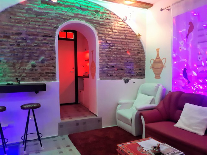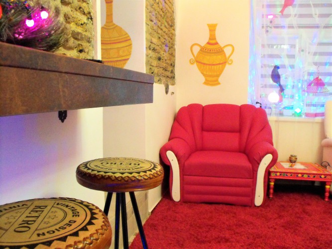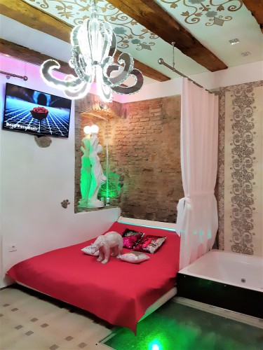 Mini apartment with jacuzzi and sauna . 25m2 . First floor , interesting interior , original lighting . Small kitchenette with oven and hotplate , fridge , room with bar , sauna (extra price) , jacuzzi , double bed , massage chair , TV and internet , heated floor , shower with toilet . Especially warm and cozy apartment with outdoor terrace .